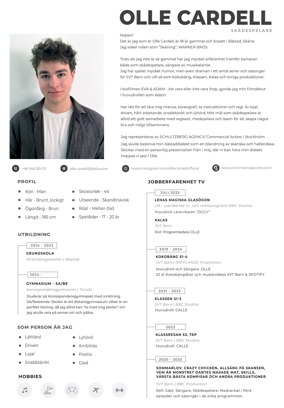 | Produktion KOKOBÄNG/ RAFFLANDE Produktion/SVT Barn | Arbeitgeber/Theater KOKOBÄNG/ RAFFLANDE Produktion/ SVT Barn | Rolle/Position Olle sångare/skådespelare -8 nya låtar släppta april på Spotify.Musikvideos kommer i maj. | Zeitraum 2024 |