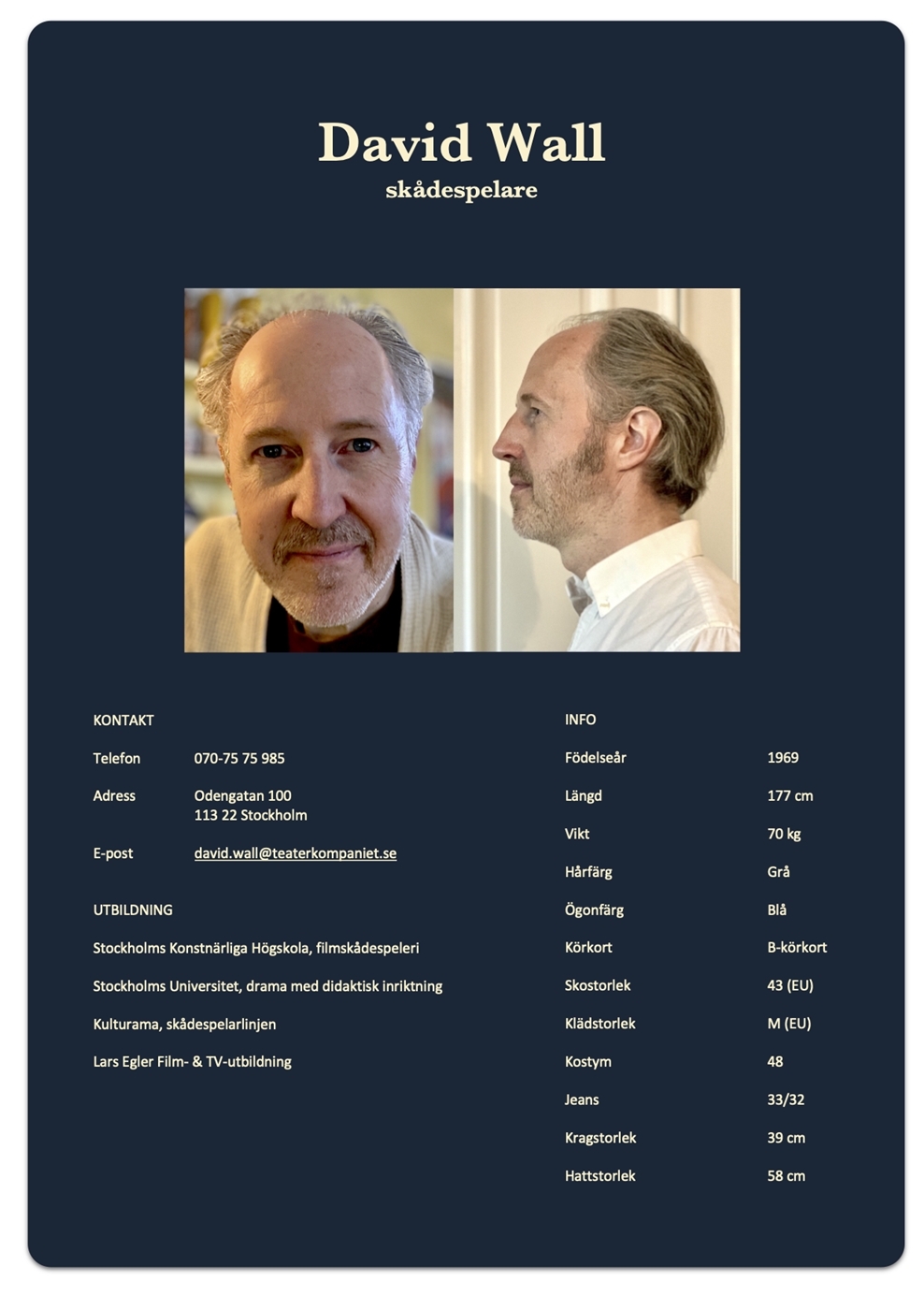 | Produktion Internfilmer Volvo IT | Arbeitgeber/Theater Lucky Punk | Rolle/Position Kontorsmannen | Zeitraum 2012 - 2017 |